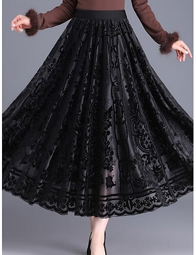 Dámské Elegantní Módní Maxi Vysoký pas Sukně Květinový Krajka Plisé Elastické Denní ulice Černá Rubínově červená Trávová zelená Kávová Jaro Samet