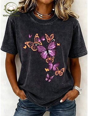 Dámské Tričko Tisk Kyselé mytí Vintage praní Motýl stylové Základní Klasické Krátký rukáv Tričkový Běžné topy Ležérní Denní Vodní modrá Černá Světlá růžová Fialová Trávová zelená Léto Jaro