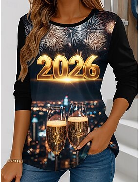 Nový rok Dámské Tričko Tisk Grafika Módní Moderní Dlouhý rukáv Tričkový Kulatý Běžné topy Denní Víkend Vodní modrá Černá Fialová Rubínově červená Námořnická modř Podzim Zima