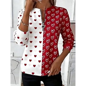 Valentýn Dámské Tričko Zip Tisk Srdce Grafika Čechy Tropický vzhled Havajské Dlouhý rukáv Do V Běžné topy Denní Jdeme ven Víkend Vodní modrá Rubínově červená Léto Jaro Podzim Zima