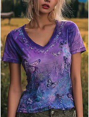 Dámské Tričko Tisk Květinový Grafika Motýl stylové Klasické Na běžné nošení Krátký rukáv Do V Běžné topy Ležérní Denní Světlá růžová Fialová Léto Jaro