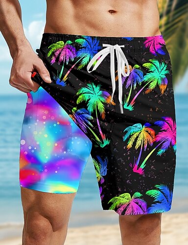 Pánské Kokosový strom Tropické rostliny Neon Podšívané šortky Plavecké šortky 2v1 Plavky pánské Středně vysoký pas Havajské Dovolená Boční kapsy S kompresní vložkou Elastická šňůrka v pase Návrhář