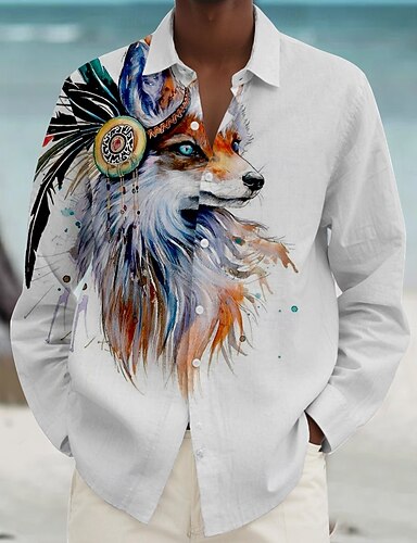 Pánské Vlk Plážová košile Košile na knoflíky Dlouhý rukáv Vinobraní Havajské Dovolená Denní Podzim Zima Jaro léto Košile s límečkem 3D tisk Bílá