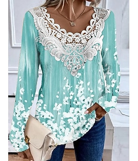 Dámská blůza tunika krajková splicing V výstřih dlouhý rukáv květinová krajková patchwork print běžné topy kulatý výstřih volnočasové fialová zelená khaki jaro a podzim před podzimem