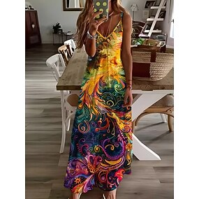Dámské Maxi šaty Letní šaty Áčkové šaty Slip Dress prázdniny Na běžné nošení Cikánský Plážové Volný Grafika Geometrický Graffiti Bez rukávů Do V Vodní modrá Bílá modrá Žlutá Rubínově červená Léto Jaro