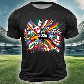 Mezinárodní fotbalový pohár 2026, globální fotbalový turnaj mužů 2026, vlajky více zemí světa, USA, Mexiko, Kanada, fotbalové míče, grafika, sportovní, fanouškovské, suvenýrové tričko s krátkým