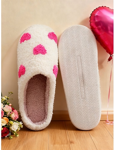 Dámské bílé sherpa fleecové domácí pantofle s růžovými srdíčky – nadýchané teplé nazouvací boty do ložnice, na Valentýna i na lenošení