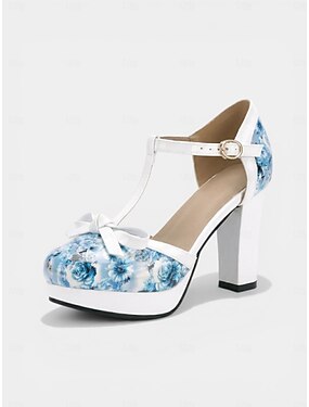 Dámské květinové boty na platformě s T-pásem, společenské boty s kulatou špičkou a mašlí na zahradní párty a svatební hosty &venkovní akce