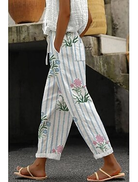 Dámské Imitace bavlny a lnu Kalhoty Letní kalhoty Šik ven Na běžné nošení Plná délka Přírodní Květinový Bez vzoru Proužky Kapsy Potisk Pružný design se stahovací šňůrkou Pohodlný Venkovní Denn