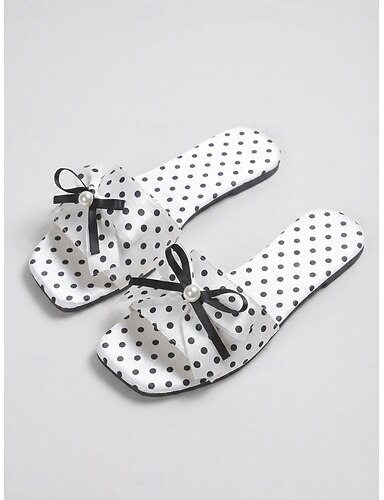 Dámské puntíkované nazouvací sandály s mašlí – roztomilé nazouvací sandály s perleťovou mašlí, ležérní elegantní pantofle k bazénu, do hotelového resortu a na letní dovolenou
