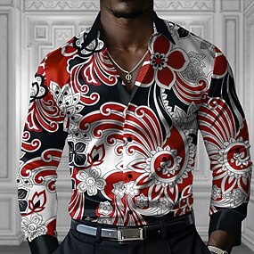 Pánské Květinový Košile na knoflíky Designová košile Dlouhý rukáv Móda pro volný čas Dovolená Večírek Jaro Podzim Přehnutý Tlačítko nahoru Rubínově červená