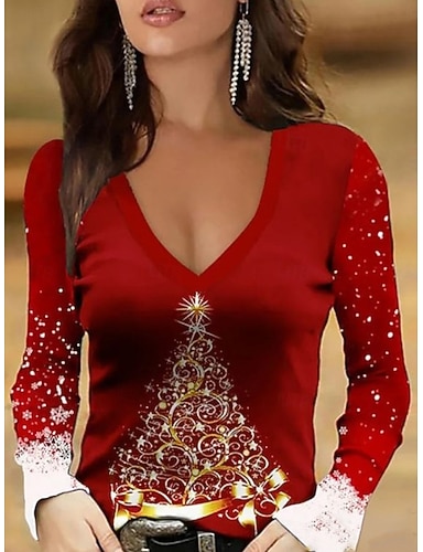 Vánoční dámský T-shirt s vánočním stromečkem Sněhová vločka Grafika Kostkovaná Vintage Stylová Klasická Dlouhý Rukáv V Neck Běžné Top Každodenní Tisk Černá Červená Jaro Podzim Zima