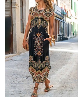 Dámské maxi šaty příležitostné šaty vintage dovolená běžný střih květinové krátké rukávy kulatý výstřih černá žlutá khaki léto