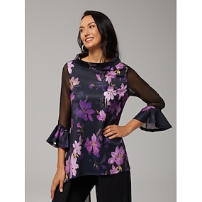Dámská halenka fialová s květinovým potiskem, strečové šifonové rukávy, výstřih bateau, ležérní, pohodlná, jaro, léto, podzim, dovolená