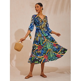 Dámské Žena Volnočasové šaty Midi šaty Vodní modrá 3/4 rukáv Řetězy Tisk Léto Jaro Jaro & podzim Do V Elegantní prázdniny XS S M