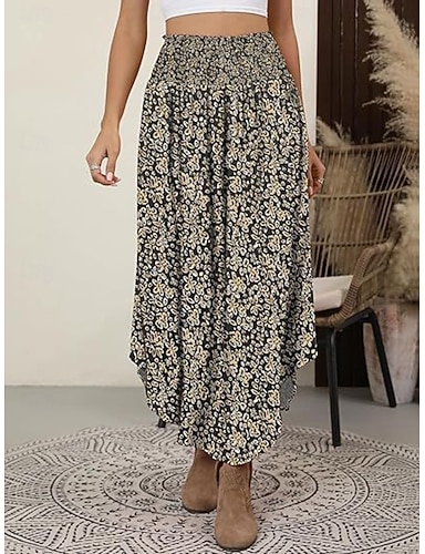 Dámské Dovolená sukně Roztomilý Na běžné nošení Maxi Střední vzestup Sukně Květinový Nabírané šaty Tisk Elastické ulice Jdeme ven Černá Léto Polyester