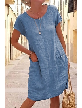 Dámské Midi šaty Imitace bavlny a lnu Bavlněné lněné šaty Úpletové šaty Módní Moderní Denní Dovolená Jdeme ven Volný Bez vzoru Poloviční rukáv Tričkový Vodní modrá Bílá Světle modrá Léto Jaro