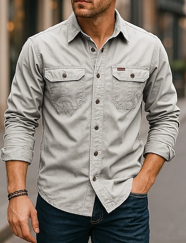 Pánské Košile Pracovní košile Košile na knoflíky Nákladní košile Černá Trávová zelená Khaki Světle šedá Dlouhý rukáv Bez vzoru Klopa Dovolená Běžné / Denní Přední kapsa Oblečení Módní Na běžné nošen