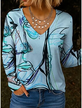 Dámské Tričko Tisk Grafika Rostliny Vinobraní stylové Klasické Dlouhý rukáv Do V Běžné topy Denní Vodní modrá Jaro Podzim Zima
