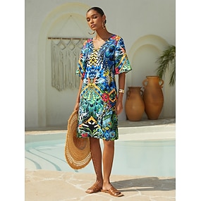 Dámské Maxi šaty Áčkové šaty Letní šaty prázdniny Na běžné nošení Plážové Dovolená Rande Běžný Grafika Geometrický Krátký rukáv Do V Světle žlutá Rubínově červená Světle hnědá Oranžová Léto Jaro