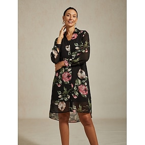 Dámské minišaty s výstřihem do V a košilovým límcem z šifonu, černé, s květinovým potiskem, elegantní, ležérní, denní, prázdninové, jaro, podzim