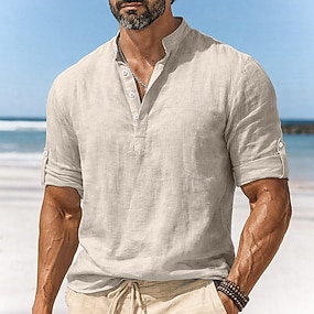 Pánské Košile Lněná košile Popover košile Letní košile Oblečení na pláž Plážová košile Pevná barva Dovolená Béžová Dlouhý rukáv Stojáček Léto Jaro Oblečení
