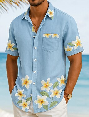 Pánské plátěná košile Oblečení na pláž Havajská košile Košile na knoflíky Aloha košile Havaj Dovolená Ležérní Vodní modrá Krátký rukáv Přehnutý Léto Jaro Oblečení Květinový