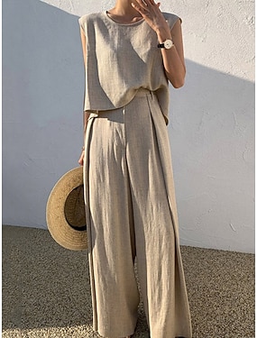 Dámské Dvoudílné sady Vesta Imitace bavlny a lnu Široké kalhoty Bez rukávů Tričkový Bez vzoru Módní Šik ven Denní Ležérní Denní Černá Námořnická modř Khaki Léto Běžný