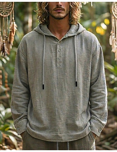 Pánské Košile Lněná košile Popover košile Letní košile Oblečení na pláž Košile s kapucí Bez vzoru Ležérní Dovolená Šedá Dlouhý rukáv Kapuce Léto Jaro Oblečení