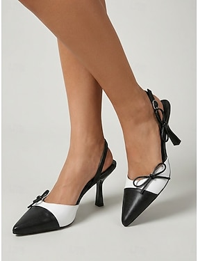 Dámské klasické černobílé boty s lodičkami s remencem - elegantní barevné bloky se špičatou špičkou a mašlí pro každodenní nošení do kanceláře, elegantní pouliční styl &společenské události