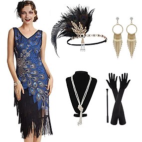 sada s klapkou šaty peříčka čelenka umělá kožešina dlouhé rukavice náhrdelník náušnice držák na cigarety šátek oblečení vintage koktejlové šaty velký gatsby dámský cosplay kostým novoroční vánoční