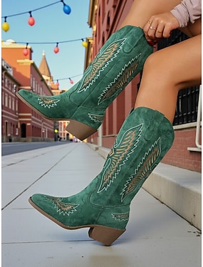 Dámské zelené semišové vyšívané kovbojské boty v západním stylu s robustním podpatkem - trendy boho kovbojské boty na vánoční festivaly, streetwear a neformální akce