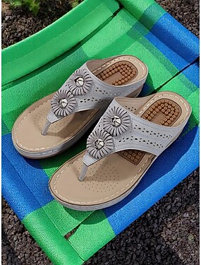 Dámské žabky s květinovým vzorem – šedý klínový design s masážní stélkou, prodyšné a stylové pro relaxaci na zahradě
