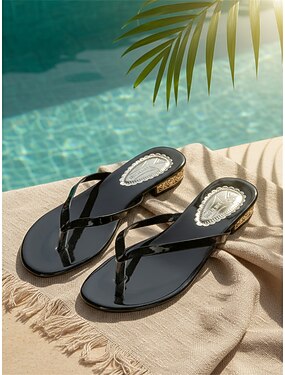Dámské metalické zlaté sandály thong - elegantní žabky na nízkém podpatku s kamínky, pohodlné letní plážové boty do luxusních resortů, na lenošení u bazénu &prázdninové večírky
