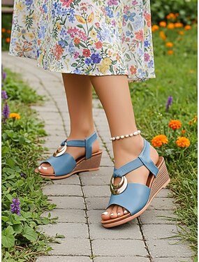 Dámské modré klínové sandály s kovovým kroužkem - letní sandály s páskem přes kotník na zahradní párty, brunch a běžné nošení