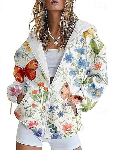 Dámské Neformální bunda Mikina s kapucí Zahřívací Pohodlné Zip Kapsy Tisk Módní Venkovní Květiny Jdeme ven Víkend Zip Standardní Kapuce Běžný Dlouhý rukáv Svrchní oděvy Bledě růžová Černá Světl