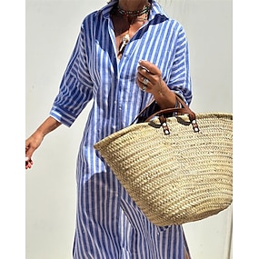 Dámské Dlouhé šaty Maxi šaty Imitace bavlny a lnu Košilové šaty Kaftanové šaty Volnočasové šaty stylové Na běžné nošení Denní Dovolená Rande Běžný Proužek Dlouhý rukáv Klopa Žlutá Světle zelen