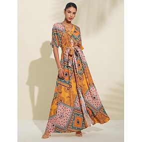 Dámské Žena Dlouhé šaty Maxi šaty Vodní modrá Krátký rukáv Geometrický Léto Do V prázdniny XS S M