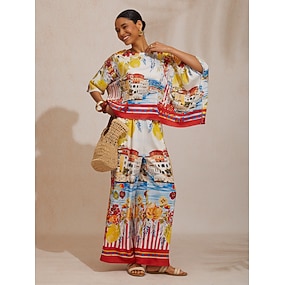 saténové volné široké nohavice dovolená umělecké/ retro potisk kauzální kalhoty