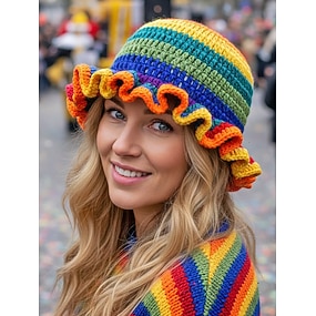 Dámský háčkovaný volánkový klobouk Mardi Gras – Vícebarevný duhový pletený festivalový klobouk na karneval kostýmovou párty a boho chic styl