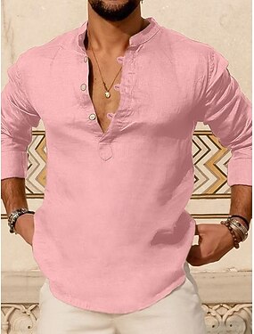 Pánské Košile Lněná košile Popover košile Letní košile Oblečení na pláž Tričko Henley Pevná barva Dovolená Domů Světlá růžová Nebeská modř Trávová zelená Khaki Dlouhý rukáv Stojáček Léto Jaro Oblečení