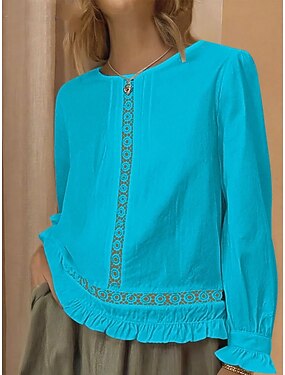 Dámské Halenka Košile z imitace lnu Výšivka Květinový stylové Na běžné nošení Dlouhý rukáv Tričkový Běžné topy Denní Vodní modrá Bílá Světlá růžová Armádní zelená Rubínově červená Léto Jaro Podzim