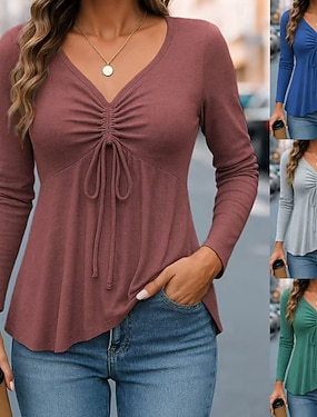 Dámské Halenka Nabírané šaty Šňůrky Pevná barva stylové Na běžné nošení Dlouhý rukáv Do V Běžné topy Denní Vodní modrá Rubínově červená Trávová zelená Světle šedá Jaro Podzim