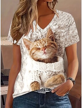 Dámské Tričko Tisk Grafika Zvíře Kočka Vinobraní stylové Klasické Krátký rukáv Do V Běžné topy Denní Víkend Khaki Léto Jaro Podzim