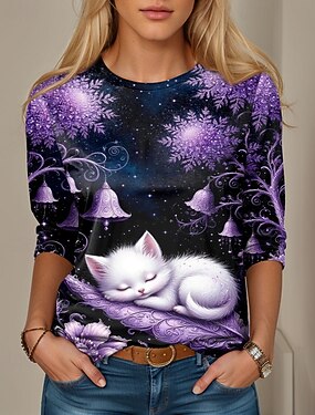 Dámské Tričko Tisk Grafika Zvíře Kočka Vinobraní Roztomilý stylové Dlouhý rukáv Tričkový Běžné topy Denní Vodní modrá Světlá růžová Fialová Trávová zelená Jaro Podzim Zima