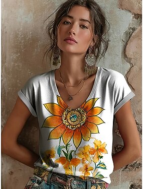 Dámské Tričko Tisk Grafika Slunečnice Čechy Vinobraní Na běžné nošení Krátký rukáv Do V Běžné topy Denní Černá Bílá Žlutá Světlá růžová Armádní zelená Léto Jaro