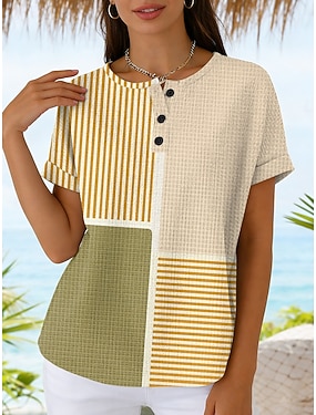 Dámské Vaflové T Košile Barevný Blok Tisk Grafika Geometrická Vintage Stylový Klasický Krátký Rukáv Crew Neck Běžné Halenky Každodenní Modrá Žlutá Růžová Khaki Letní Jaro