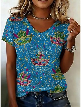Karneval Dámské Tričko Tisk Grafika Vinobraní Na běžné nošení Krátký rukáv Do V Běžné topy Denní Víkend Oblečení na dovolenou Vodní modrá Léto Jaro