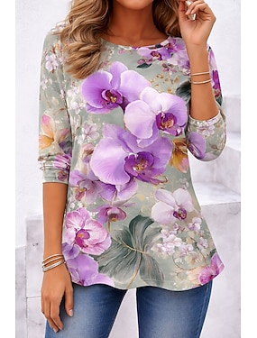 Dámské Tričko Tisk Květinový Grafika Rostliny stylové Klasické Moderní Dlouhý rukáv Tričkový Běžné topy Denní Víkend Oblečení na dovolenou Vodní modrá Světlá růžová Trávová zelená Léto Jaro Podzim