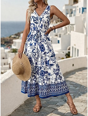 Dámské Maxi šaty Áčkové šaty Slip Dress prázdniny Na běžné nošení Venkovní Jdeme ven Standardní uložení Květinový Bez rukávů Do V Vodní modrá Léto Jaro